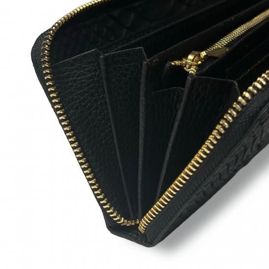 漆黒の存在感を纏うダイヤモンドパイソンを、贅沢にセンター1枚取りで仕立てたラウンドファスナー長財布です。